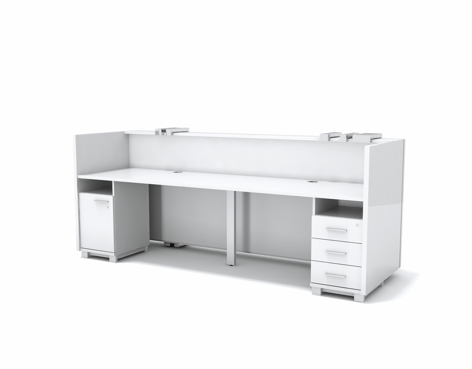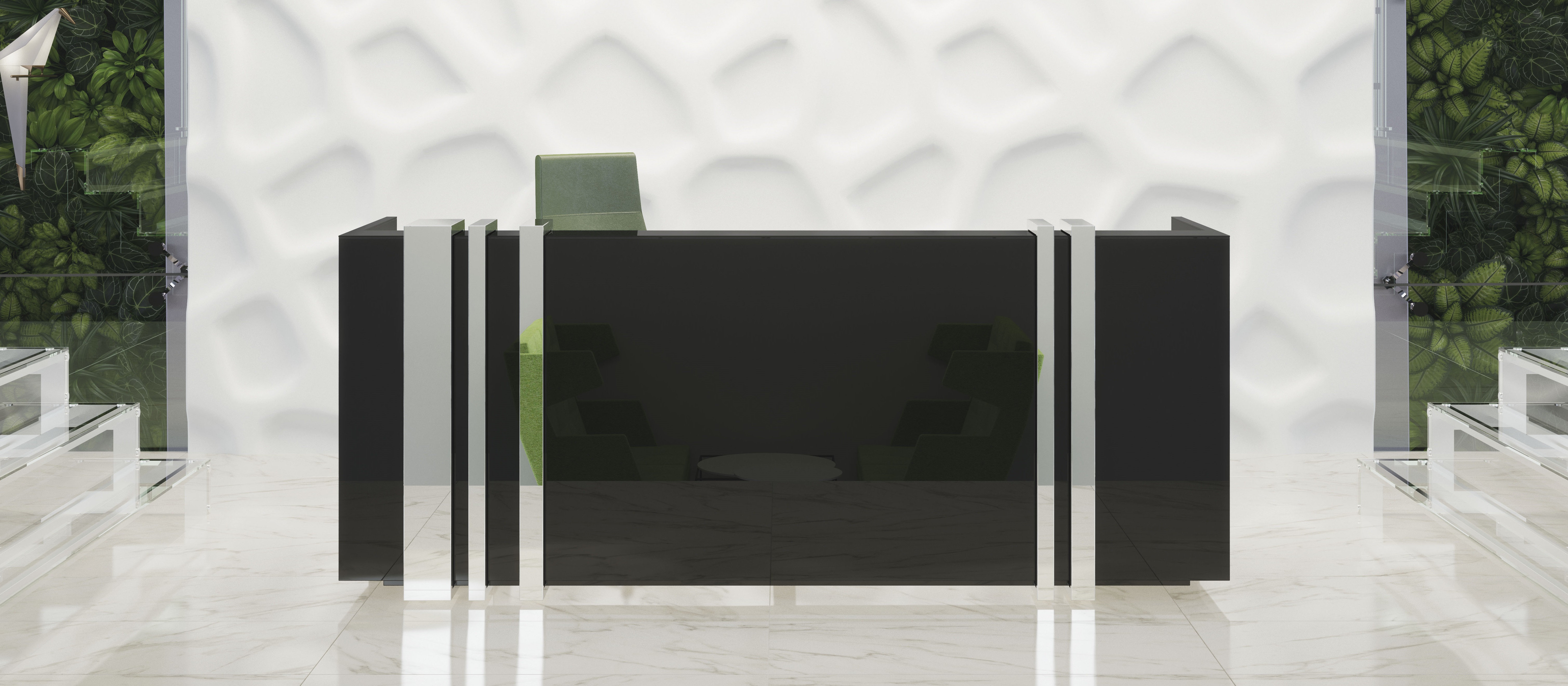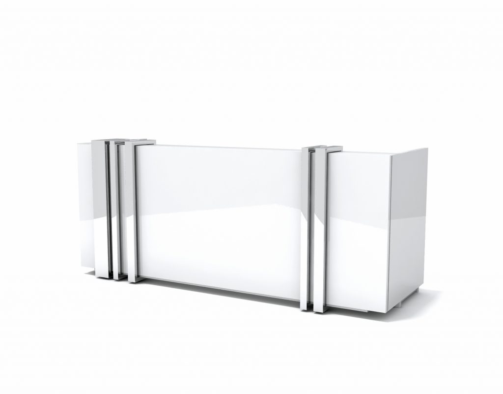 Wyrazistą, zwartą bryłę lady zdobią pionowe klamry z chromowanego metalu. Front i boki wykonano z płyty na wysoki połysk, przez co mebel znakomicie rozświetla pomieszczenie.